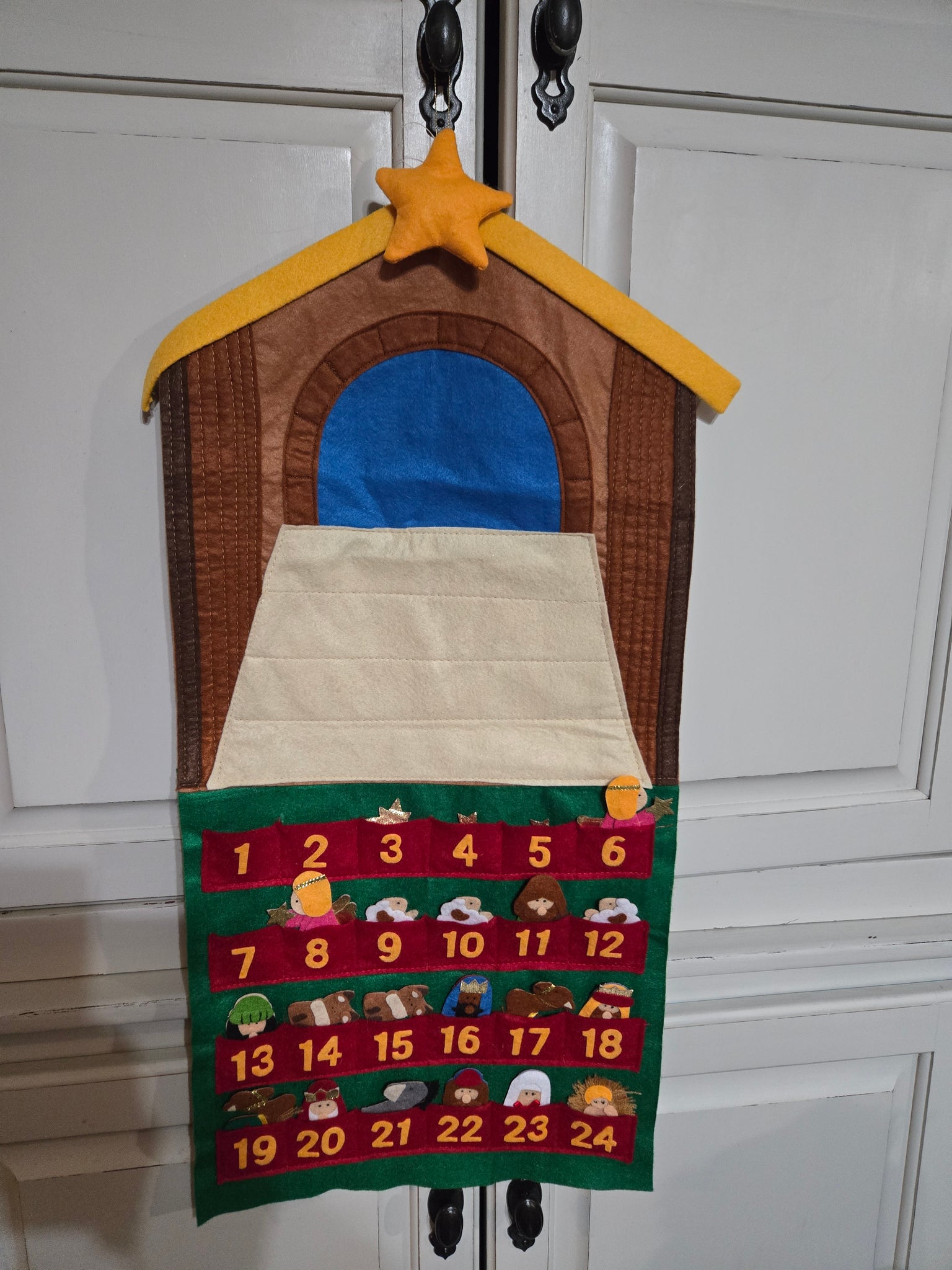 Bring the true meaning of Christmas into your home with this beautiful, colorful hanging nativity advent calendar. Perfect for counting down the days until Christmas. This Advent calendar is handmade with felt nativity characters that stick to the manager scene with velcro. There are 21 pieces (missing the moon and two stars) to create the complete nativity scene. Candy canes or other treats can be used in place of the missing pieces, or you could make the nativity scene at the beginning of Advent and place a treat in each pocket. This item is used but in good condition and ready for a new family tradition!