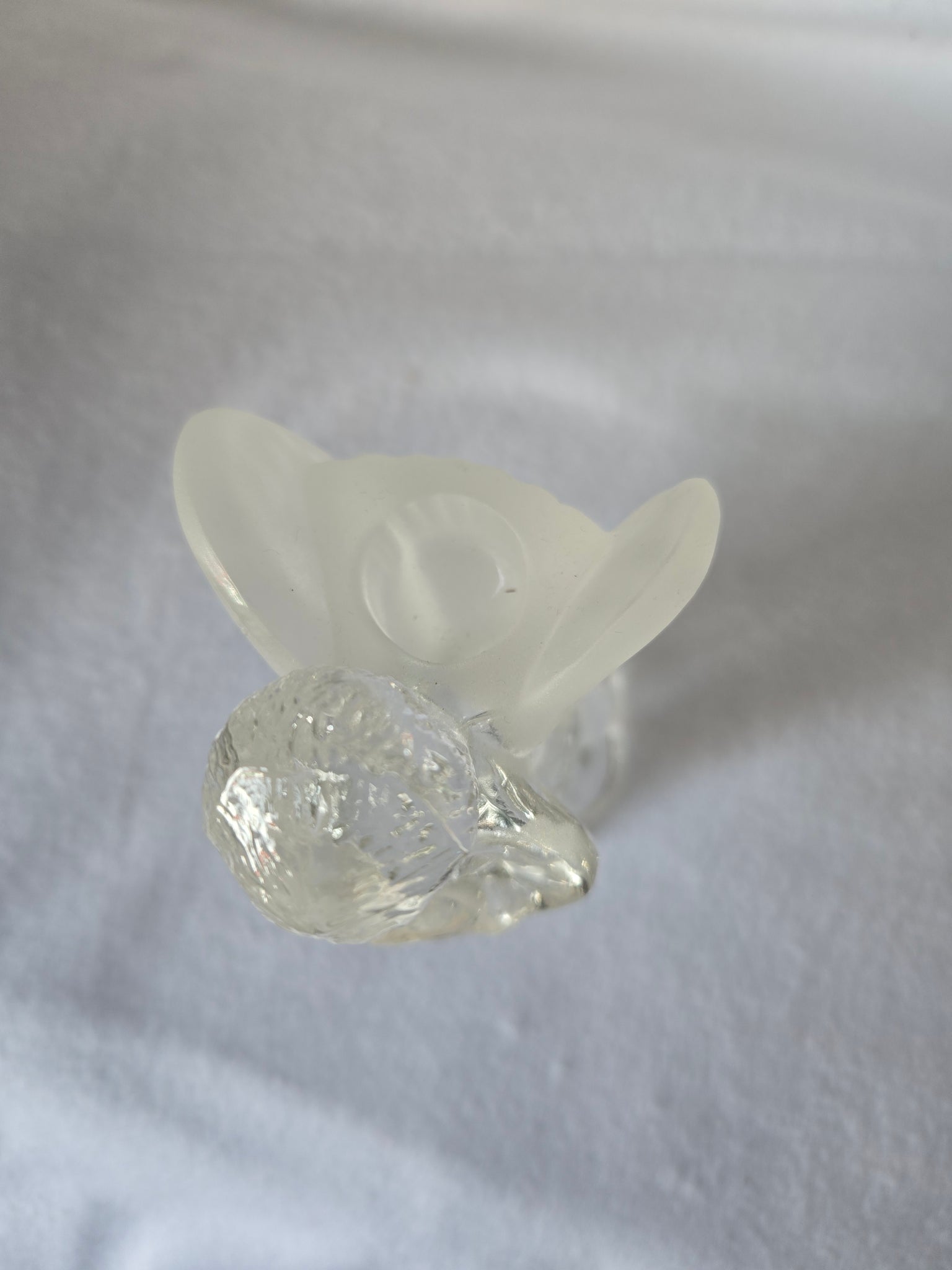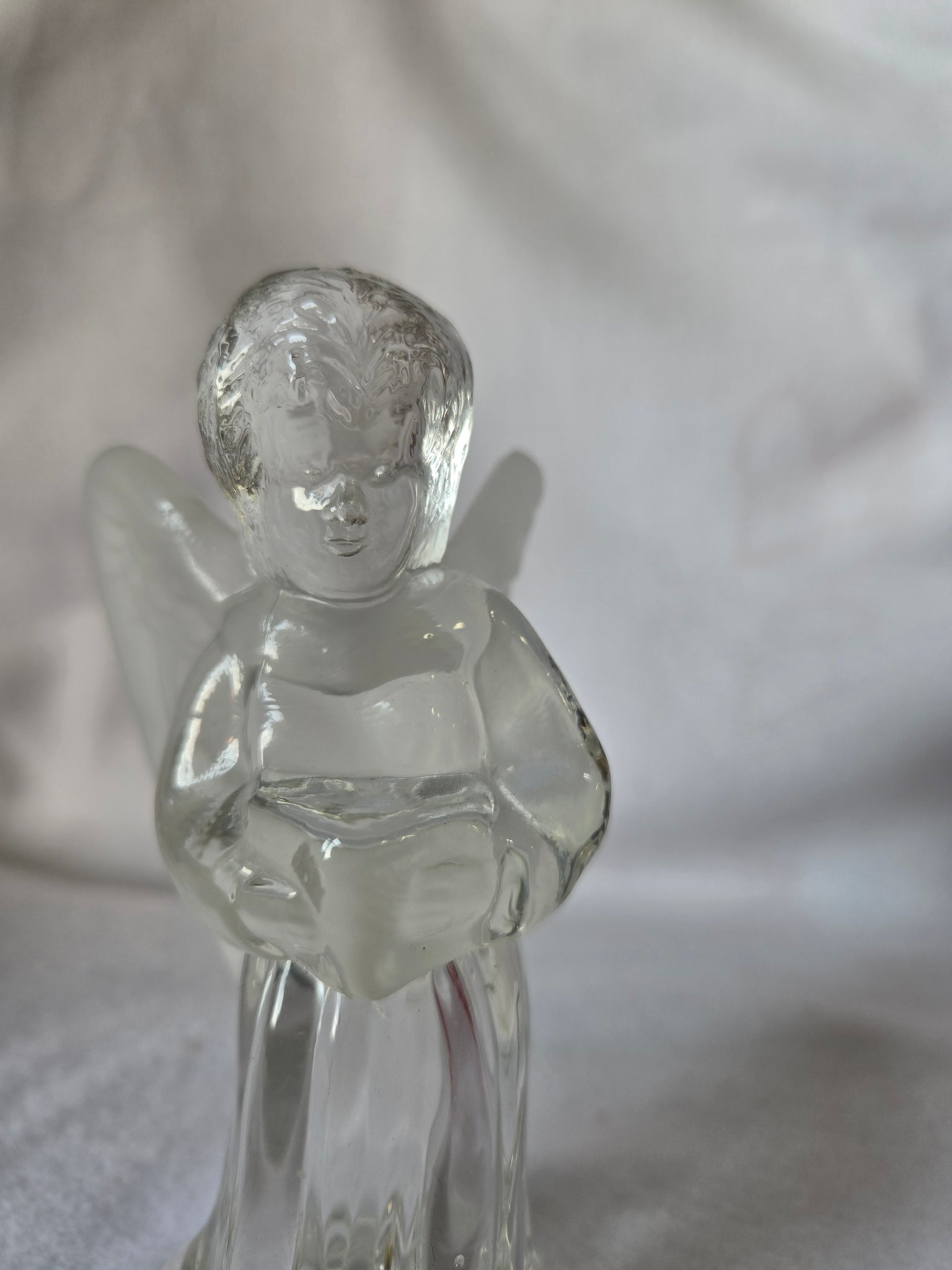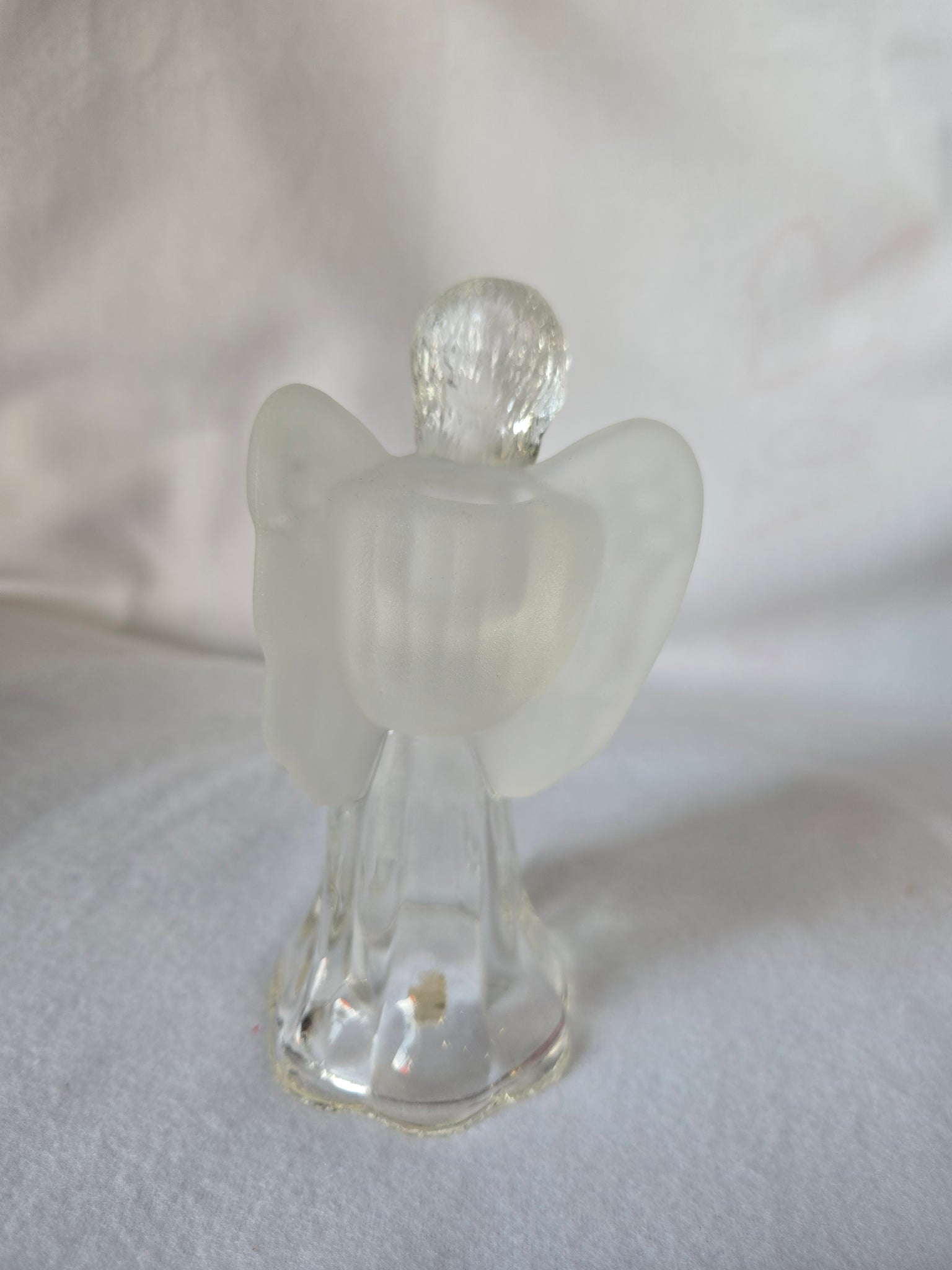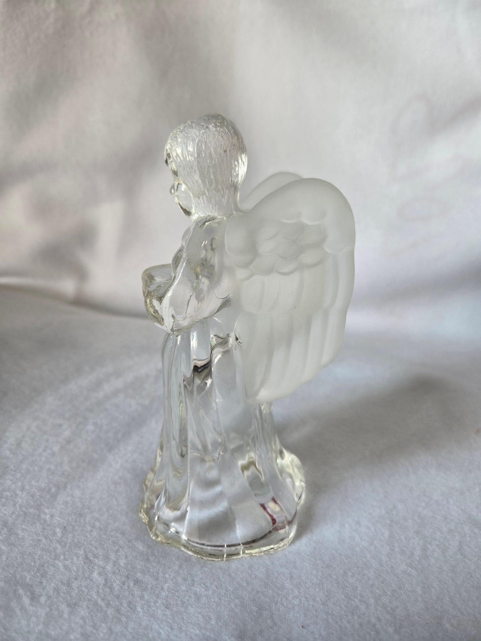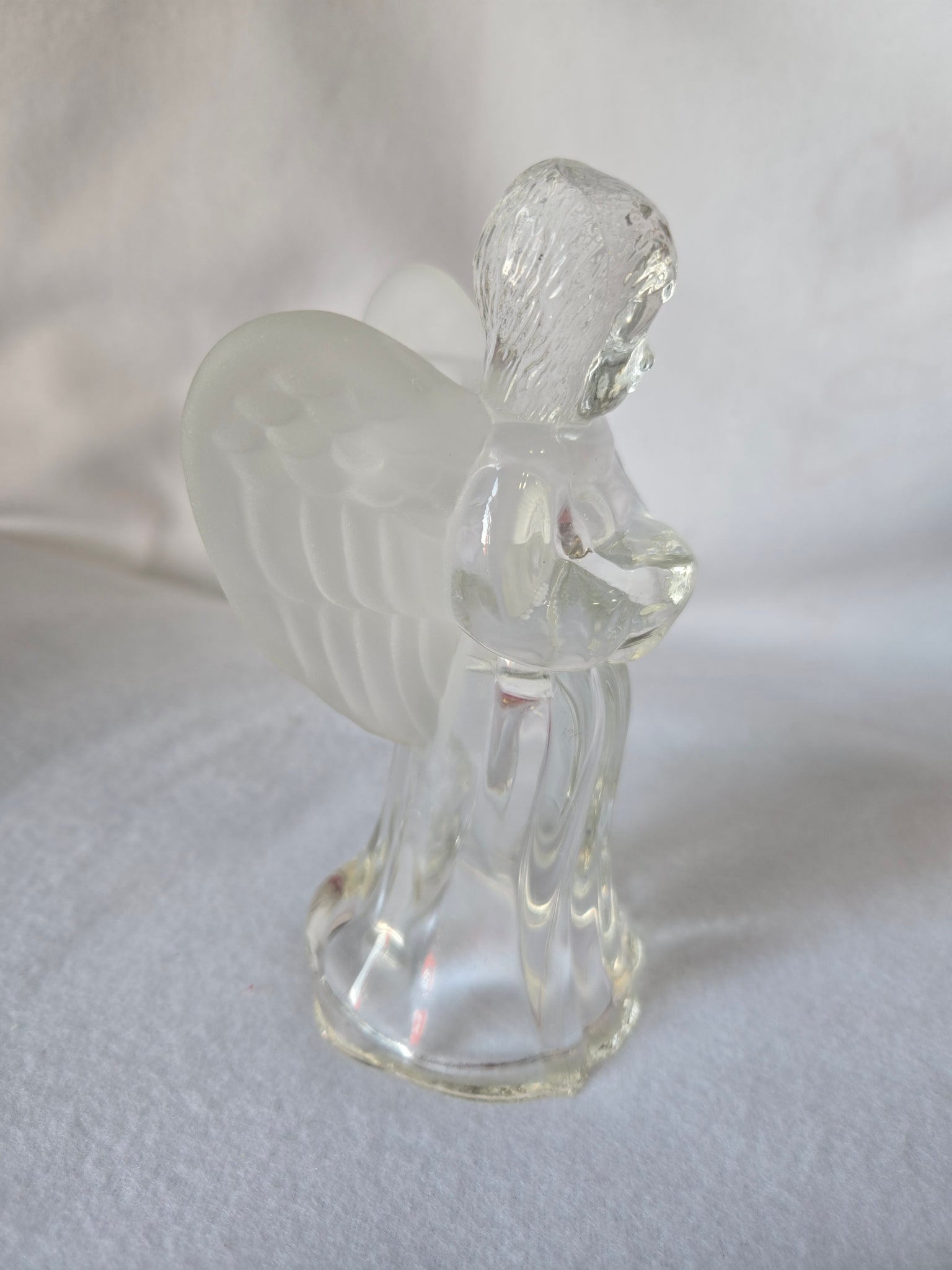 | This beautiful vintage clear glass angel figurine also serves as a charming candle holder. The piece features a clear glass body and a detailed, slightly frosted finish on the wings. Approximately 6" tall and Pre-owned in excellent condition. |