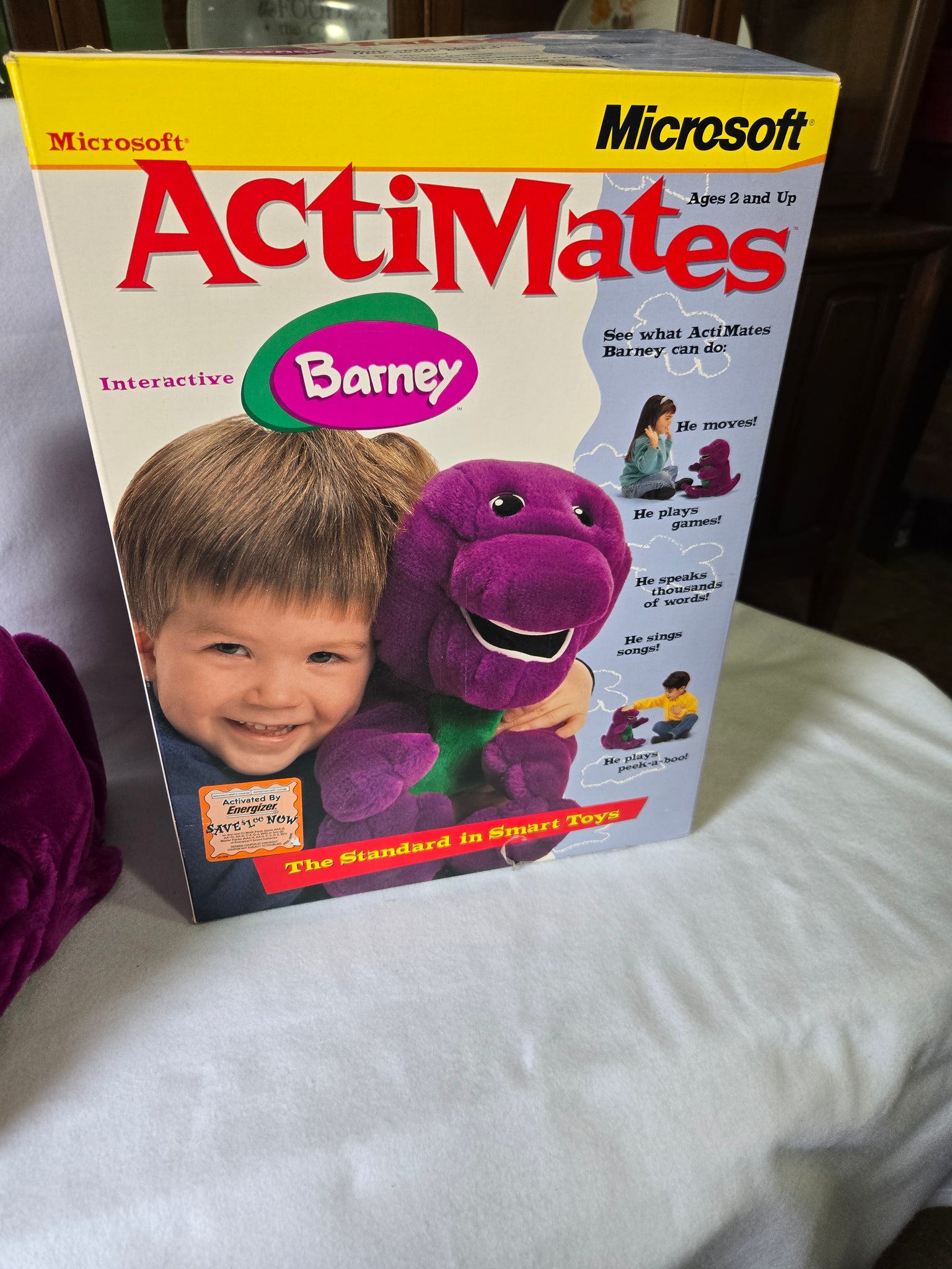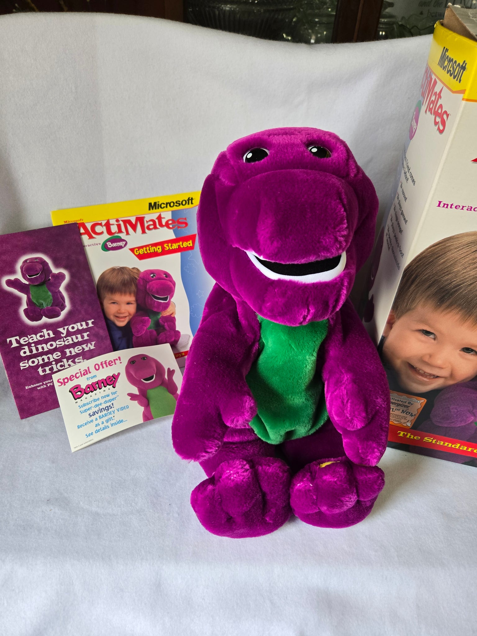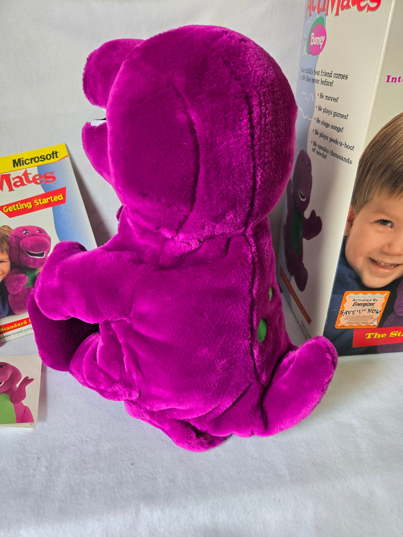 A rare find for collectors and fans of the beloved purple dinosaur! This is an original, new-in-box Microsoft Actimates Barney, a highly sought-after interactive toy from 1997. The toy "speaks thousands of words" and sings songs, providing a rich interactive experience for children. The toy also engages in playing games, including peek-a-boo. This does not include the PC Pack or discs. This is a perfect piece of nostalgia for those who grew up watching Barney & Friends. Don't miss the chance to own a piece of interactive toy history! Like new condition.