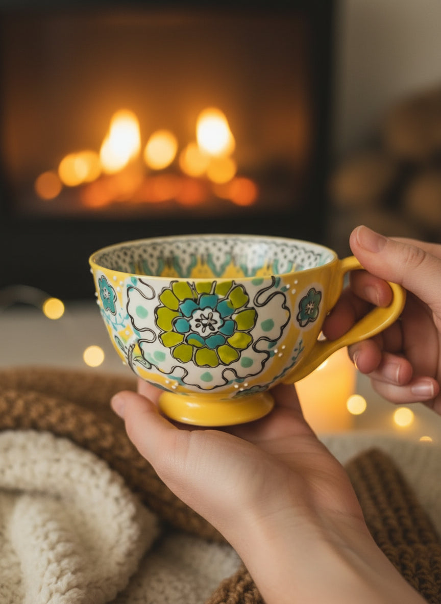 It features a charming design with a floral pattern, perfect for everyday use. The mug is adorned with a twisted handle and textured details, adding a touch of art deco style to your kitchen. With a 16 fl oz capacity, this hand-painted mug is microwave and dishwasher safe, making it convenient for enjoying hot or cold beverages.